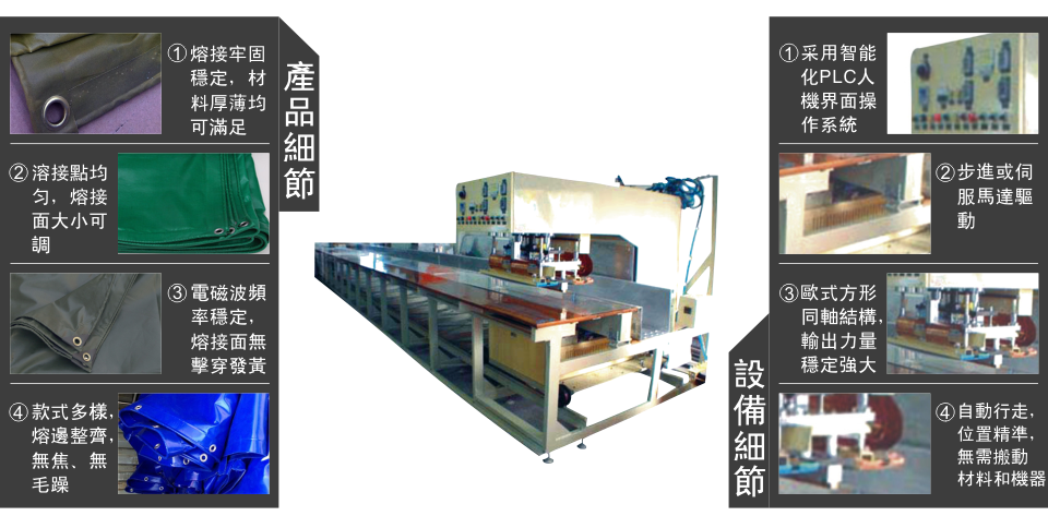 4、自動滑動連續式高周波膜結構焊接機又稱為高周波汽車篷布帆布接駁機、高周波帳篷布熔接機、高周波電影幕布熔接機、高周波膜結構拼接機、戶外膜結構高周波焊接機、膜結構高周波熔接機、高頻戶外遮陽布熔接機、高頻廣告噴繪布焊接機、高頻PVC布熔接機、高周波塑膠塑料熔接機、高周波熔接拼接機、高周波汽車篷布焊接機、高周波戶外帳篷制作機、遮陽膜結構高周波焊接機、廣告噴繪布高周波接駁機、高周波熱汽球制造機、電影幕布高周波縫合機高周波帆布熔接機,高周波膜結構熔接機,高周波帆布機,汽車帆布熔接機。